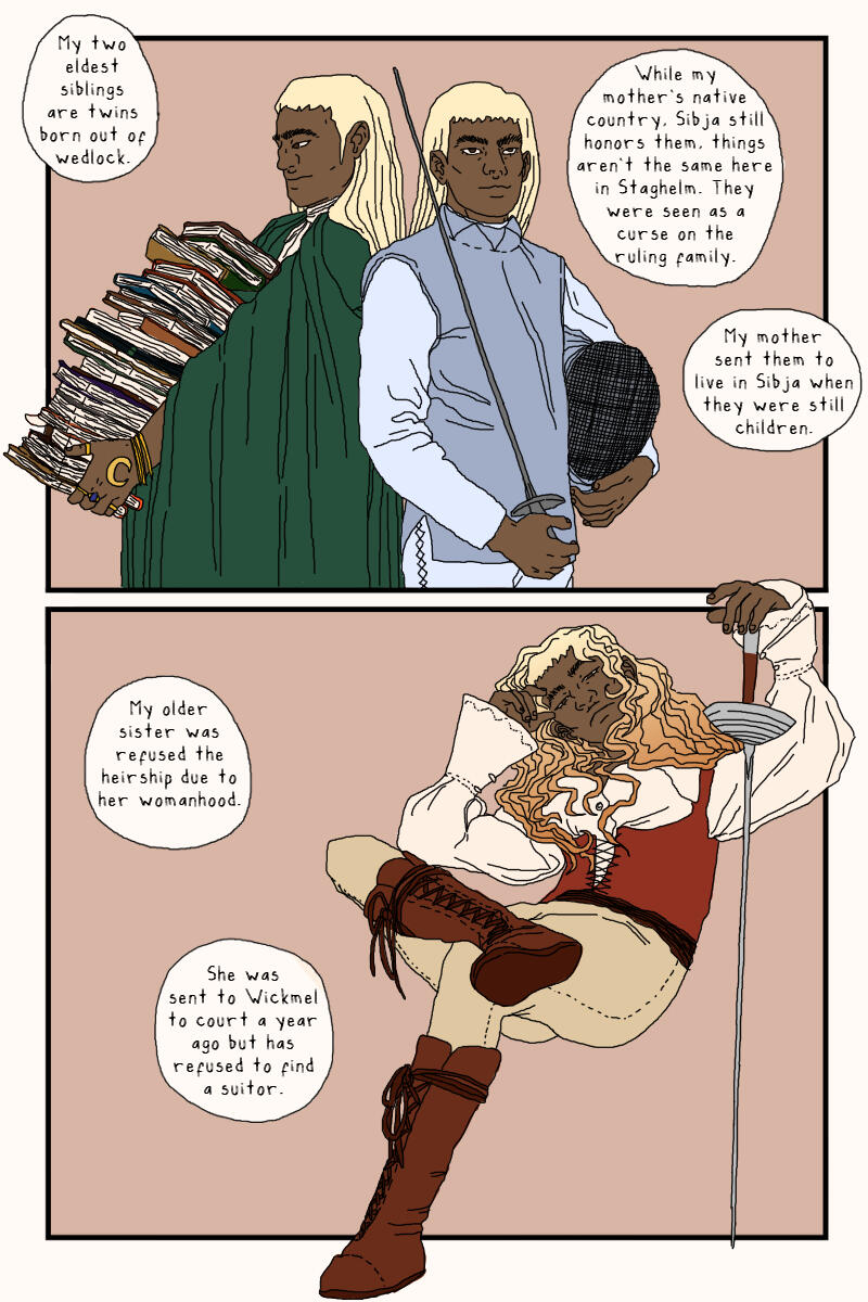 "I think I should start off with the disclaimer that The Art of Running Away is the work of a dear friend of mine. That won't really affect how I talk about it though, because regardless of that context it's one of the most beautiful, sincere, emotional comics I've read this year. The comic follows two siblings driven apart after the slaughter of their village, each going on difficult paths to try to figure out what happened and find some way to deal with it, although neither of them are really certain what they're really trying to do, how to even begin dealing with this loss.On their journeys they run into a large extended cast, made up of clashing political factions and mysterious characters, some trying to help them, some only appearing to, and some outright hostile. The narrative style of the series is very mysterious, content to just drop you in a situation with little explanation of what happened, and let the character dynamics play out, the incredibly likeable characters instantly enough to keep you wanting to know what happened to get them to this place.When exposition is given, it's in the form of almost story book like narration, accompanied by some gorgeous imagery. Some extremely heavy subjects are talked about in these narration sections, but always handled with grace, direct about what happened but without every obsessing over gruesome details. This is a series about the trauma that lives in the outcome of those events, and about the life you build as you survive them, not the horrific reality of what happened itself, so naturally the series delicately addresses the horrific reality of what these characters have gone through, or are still going through, but with a balance of just how much to show and how much to imply that's rare to see.A lot of that grace comes from the truly stunning art style. The series is almost entirely black and white, with occasional punches of red and yellow, backgrounds swathed in complete darkness while the characters and important objects are completely white, giving this intimate focus in on the characters and their interactions, the high contrast between the characters and the backgrounds highlighting the striking compositions and creating the sense that nothing matters to these characters but each other. The style is breathtakingly romantic, I always think the sign of a truly strong composition is that even when you're squinting and or the image is too small to see the details clearly the page is still beautiful at a glance, and this is absolutely true of this series, made even better by the evocative meaning of the imagery itself.The series is full of gorgeous visual metaphor, subtle gestures and expressions that communicate a ton about the characters, the simplicity of the style drawing attention to each detail and draw you in more. Text is used super creatively, constrained by the shape of the character to mimic anxieties threating to explode out of them, or placed on the hands or other body parts of the characters, making the characters words a physical part of their movements. Great care is taken in the placement of even simple speech bubbles or bubble less text, making sure they're as much of a part of the gorgeous simple composition. The slow pace of the lettering also really helps here, concise narration and dialogue spread across multiple gesture and expressions to let the meaning of the words breathe and give us insight into how multiple characters feel about what was said.My one issue here is that sometimes the thin font can be a bit difficult to read against the dark background when there aren't speech bubbles. From what I can gather this varies by device and is somewhat related to the compression of the image, not the original design, but it can still really be a problem. I also think fight scenes can be a bit difficult to follow, the usual trade off that striking compositions are great at showing a still moment, but the lack of speed lines and other abstract details can make it difficult to get your head around and really feel the impact of a movement, which can become an issue when you're following a scene with a lot of different characters playing off each other.It does work for the most part, some of the most brutally effective moments (including one not pictured here that I'm totally not still mad about nope!) happen during action scenes, and the creativity of different characters weapons and fighting styles, and what they express about their personalities and backgrounds are always fun to see.Nowhere has more variety than the fantastic character designs though. The story crosses countries and dozens of fantastically developed cultures and religious beliefs, with gender and ethnicity playing a large role in the story, and the large cast all needing to be clearly differentiated. You'd think the art style would cause a lot of problems for this, the black and white style means you're unable to differentiate characters with color or even grey scale value differences, unable to show a character's skintone, hair color or fashion choices, many characters regularly wearing little or no clothing.This means the characters need to be differentiated on the power of their faces, hairstyles and bodies alone, and lord do they deliver. Facial tattoos and scars, expressive hairstyles and facial hair, different body types and disabilities, there is so much variety to the characters. I think there's a bad habit in a lot of indie art that claims to be diverse of only varying skintone while giving all your characters incredibly Eurocentric features, so I find it incredibly refreshing to see a series that can show these characters' race without even using different values. The designs are so gorgeous, expressive interesting characters whose faces and bodies alone tell so much about their life experiences and personality.The cast is all incredibly likeable, or love to hateable, even with the weight of some of the themes the series stays funny and 